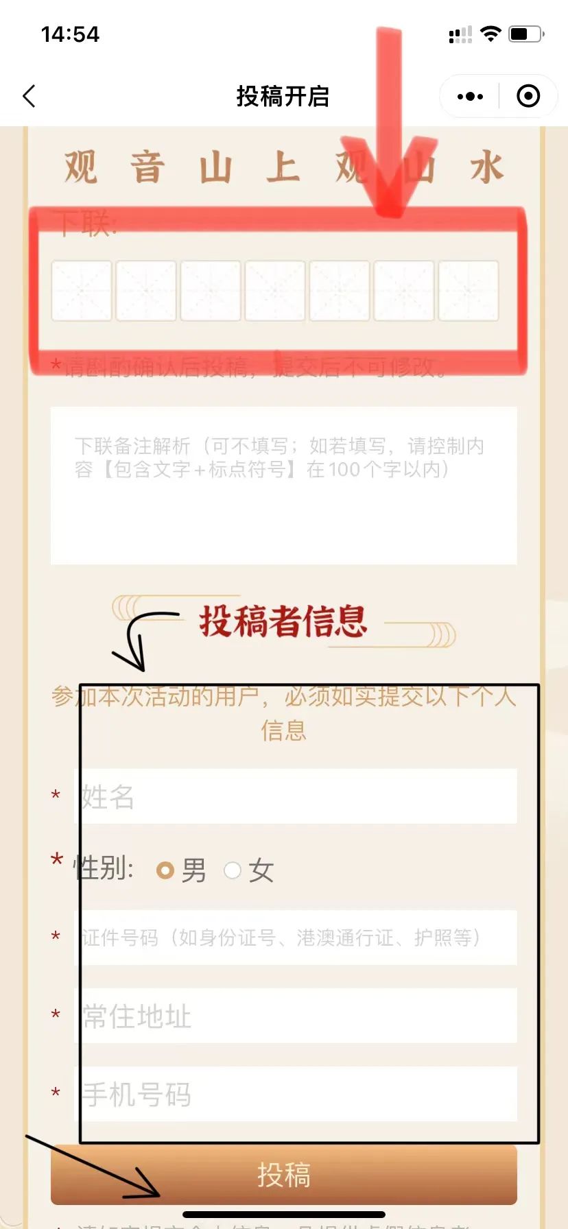 在“108万观音山上观山水征联”小程序界面找到“投稿开启”下方的“点击进入”