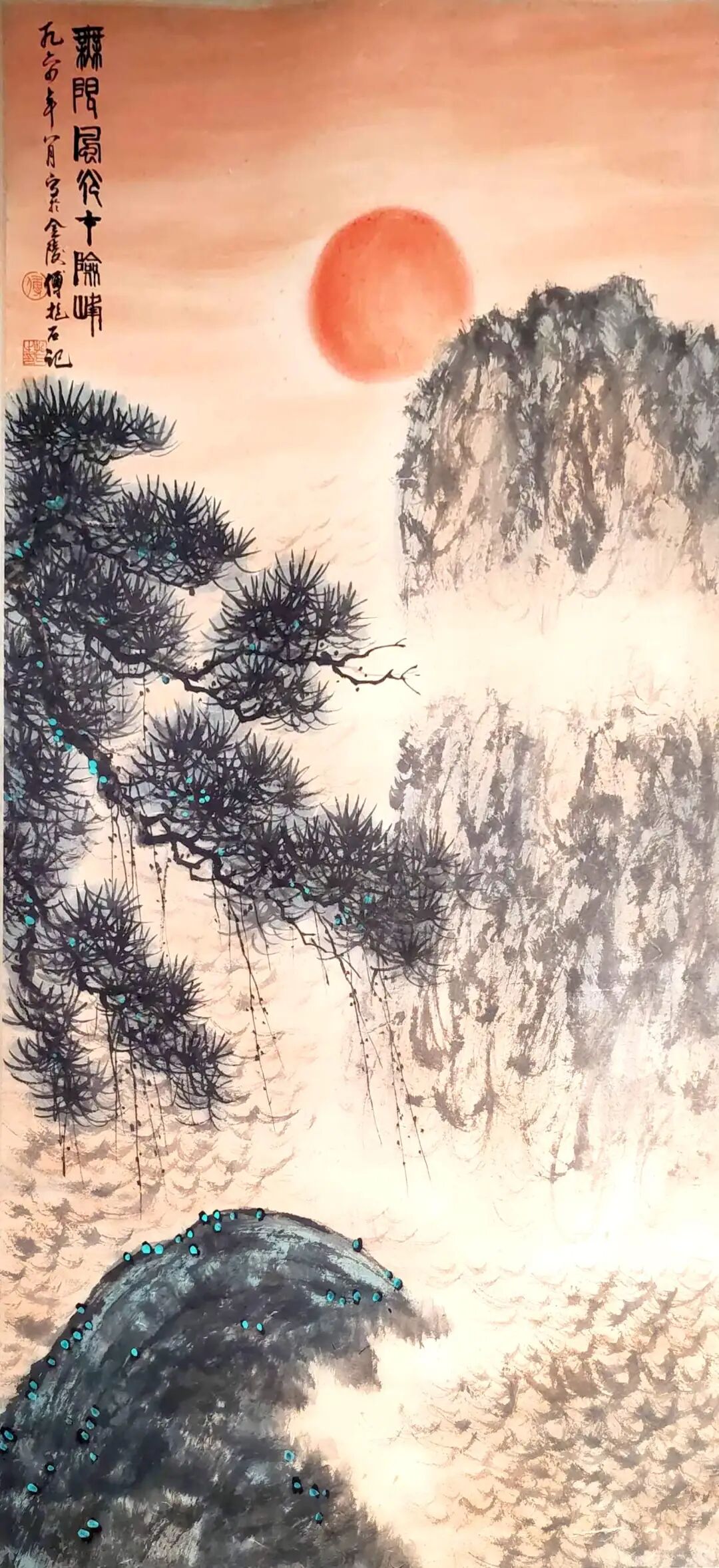 另外一幅《日落松风起》,则藏着他“以情驭笔”的另一种温柔。落日悬在山尖,暖橙底色裹着淡墨,松针沾着细碎的蓝,风裹着松枝的墨色轻颤,像暮雾里漏下的光。傅抱石说“古人的诗意不是背出来的,是走进去活出来的”,这画里的闲淡,不是复刻“松风起”的程式,是他在金刚坡傍晚见过的那轮落日:山石的皴纹软了些,松枝的墨色轻了些,连空气都裹着“心在山河,身自悠然”的热。