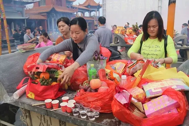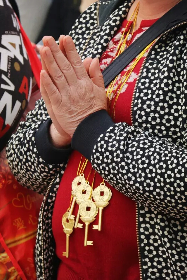 游客携“财米包”“利是”“金钥匙”等物虔诚祈福