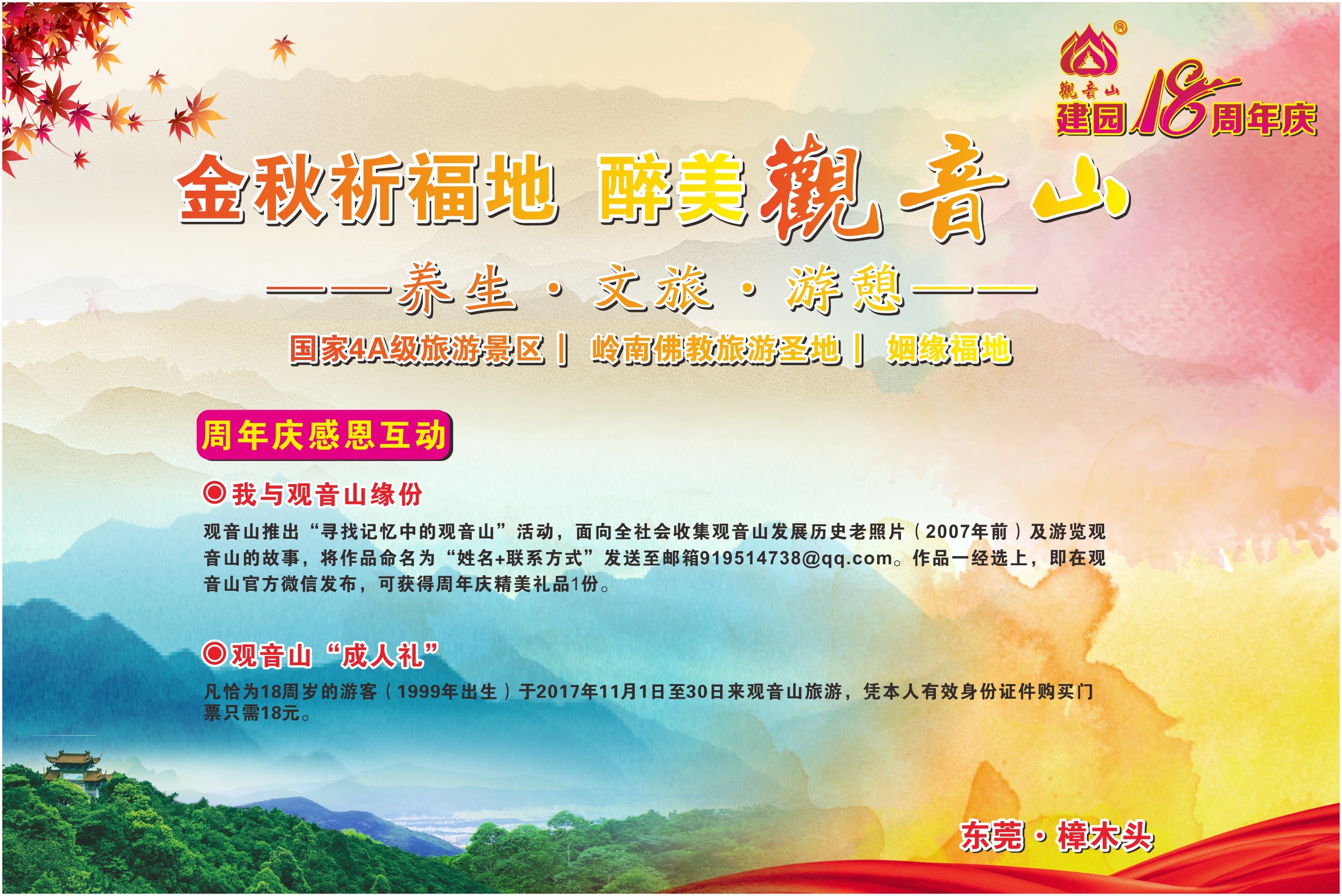 18年前,观音山还是一座孤零零的山,没有自己的文化、特色、底蕴。一路走来,栉风沐雨历经诸多磨难,也收获众多荣耀与喜悦,成长为祈福圣地、岭南的佛教名山、中国十大爱情主题景区联盟的姻缘福地。诸多荣耀,除了观音山全体员工的共同努力建设外,也少不了广大游客市民的大力支持。11月30日就是广东观音山国家森林公园建园18周年,为迎接这个喜庆的日子,观音山将从11月1日至30日,推出系列优惠活动,回馈广大新老客户,为广东观音山国家森林公园庆生、祝贺!“