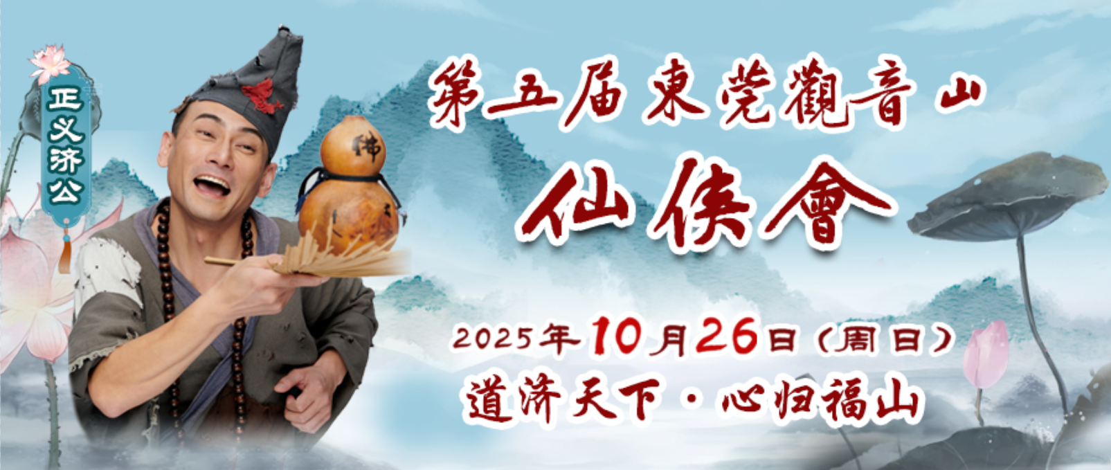 2025年10月26日,第五届观音山仙侠会·逍遥游之济公主题专场,观音山邀请了话剧演员、网红达人@正义济公 化身惩善扬恶,点化世人的济公。届时,将与众多影视剧中经典NPC等齐聚观音山,沉浸式游园互动,开启一场金秋的奇幻之旅!