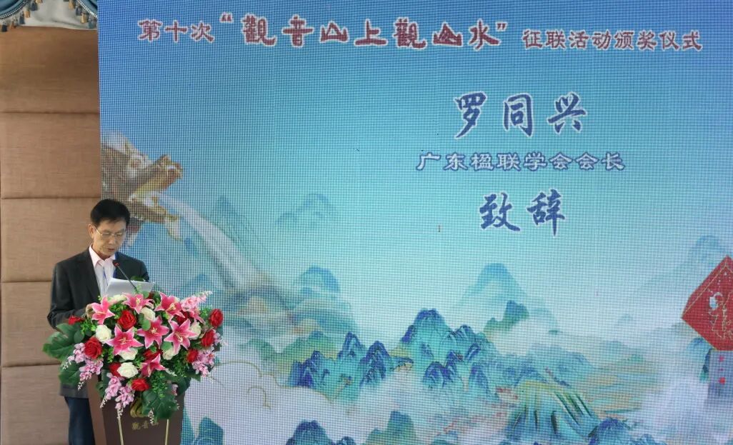 广东楹联学会会长罗同兴表示,自 2025 年3月起,广东楹联学会接受征联组委会的委托,组织了广东省楹联专家,还特邀中国民间界著名专家以及携手五岳所在省份的专家组成评委会,分别对五岳景物元素作品、观音山景物元素作品先后进行了初评、复评、网络投票评选、综合评和终评。最后,评委会分别从五岳景物元素作品、观音山景物元素作品中评选出 20 句优秀下联。遗憾的是两个项目均未评出符合征联启事要求的最佳下联。今天在这里举行隆重的颁奖仪式,既是对获奖作者的嘉奖,又是对文旅事业的赋能,并充分肯定了观音山对楹联文化发展的积极作用。