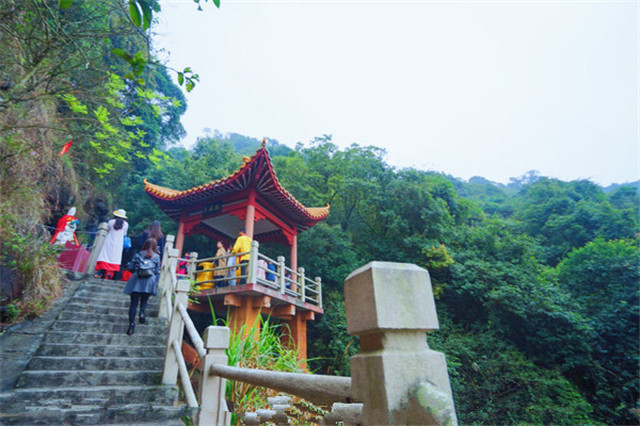 对比西北的大山,珠三角冲击平原的山总显得秀气。观音山虽然海拔不高,不过山路还是迂回曲折的。从电瓶车下车后,就开始了起起伏伏的徒步。