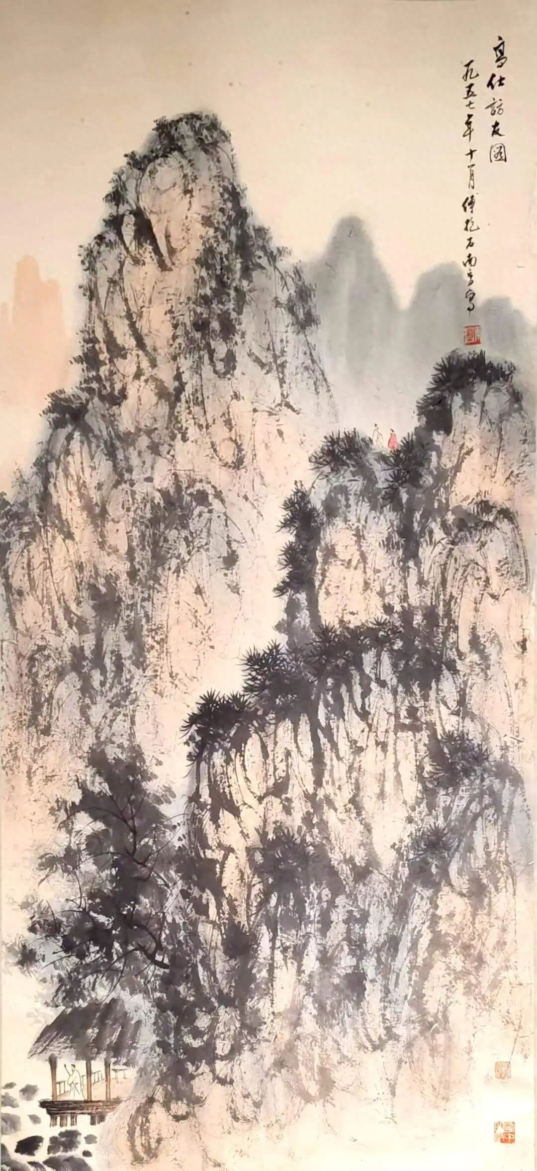 从文人精神上分析:这幅画的魂,在“人与山的对话”:崖顶的望者、亭中的侍者,是傅抱石自己——他以高士的身影,把“巴山的苍莽”译成“文人的坚守”,把“访友的雅事”写成“精神的相契”。1957年的南京,正是他从“金刚坡的野逸”转向“新山水的壮阔”的节点,这幅画里的危崖未失金刚坡的骨,高士未失文人的魂——傅抱石的山水从不是“摹山绘水”,而是“以山为纸,写己之心”。当散锋的墨色褪尽,留在苍崖间的,是文人的风骨,是笔墨的狂歌,是傅抱石以一支笔,在时代里守住的“文心”。