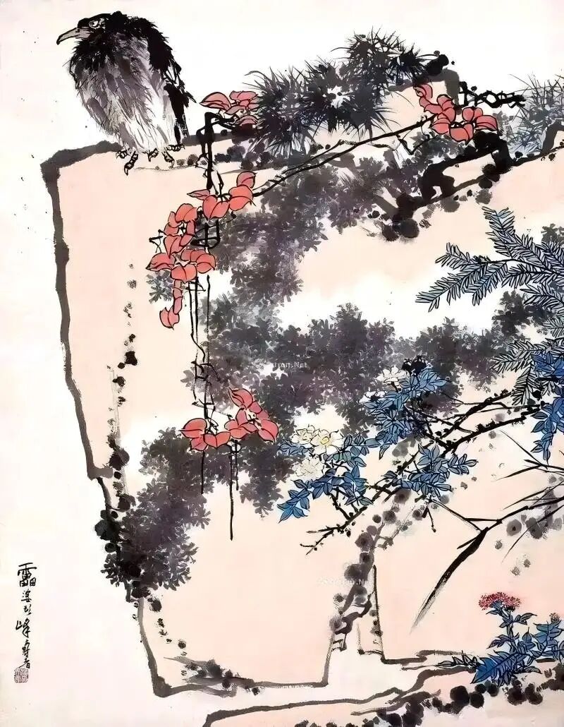 文革期间,他被打断腿、封了画室,却在床板上画小稿:松还是苍的,鹰还是立的,花还是红得扎眼。这阶段的《鹰石山花图》,鹰的爪子攥着石头,笔墨比早年更重,像在纸上“钉钉子”——这种“越难越要站着”的劲儿,戳中了今天年轻人对“坚韧”的共鸣。